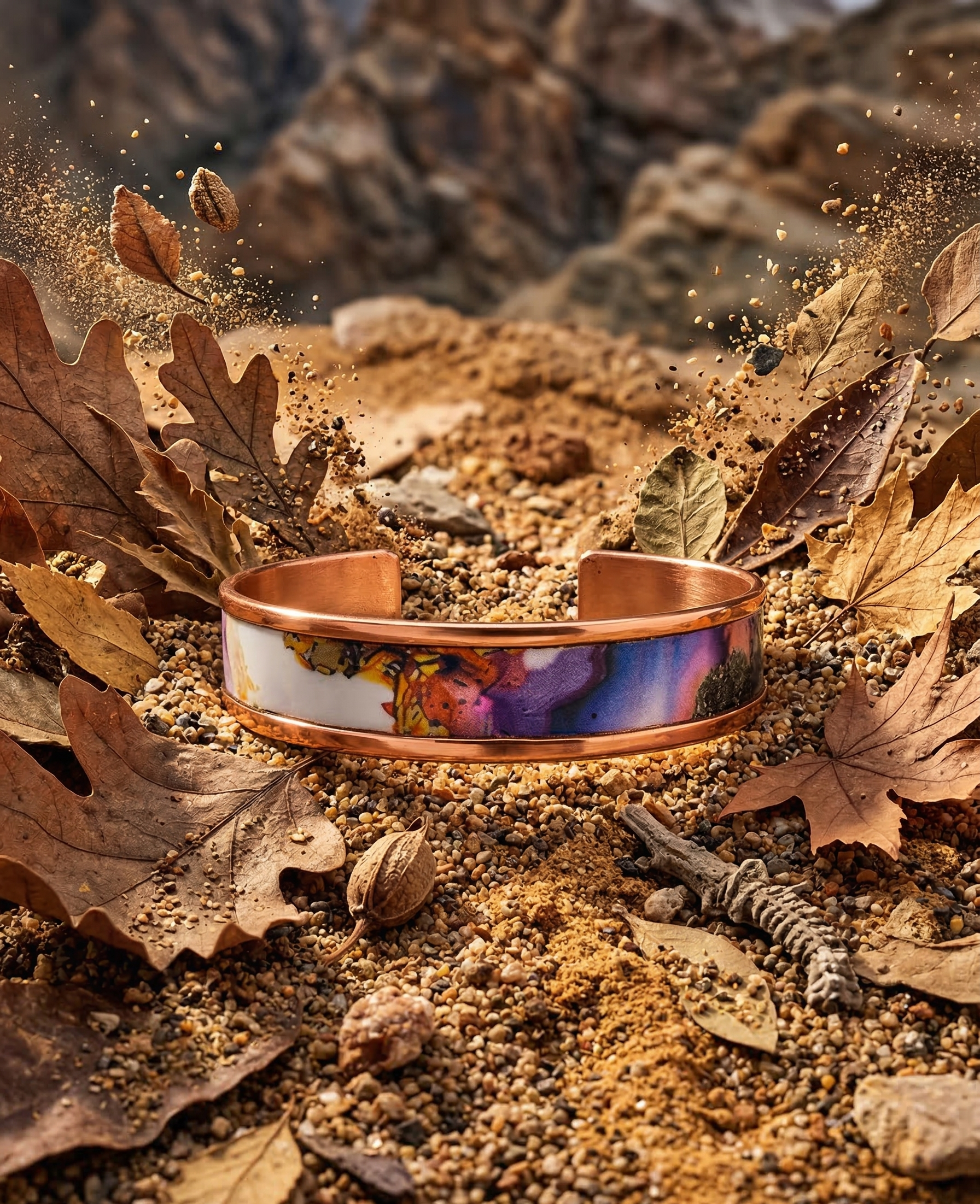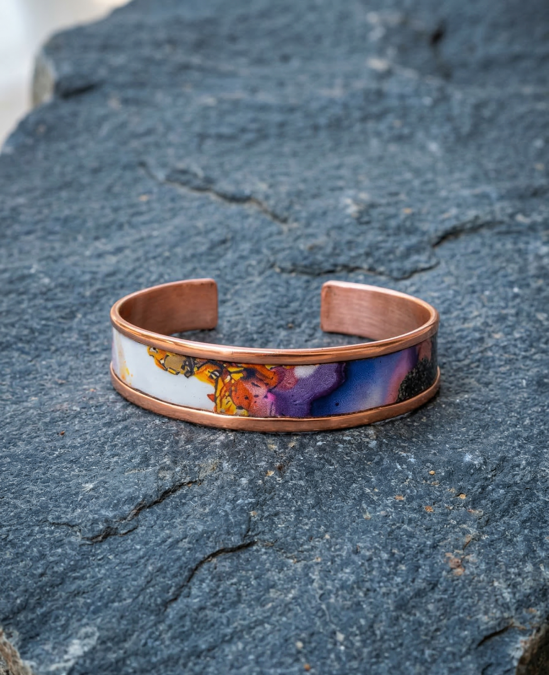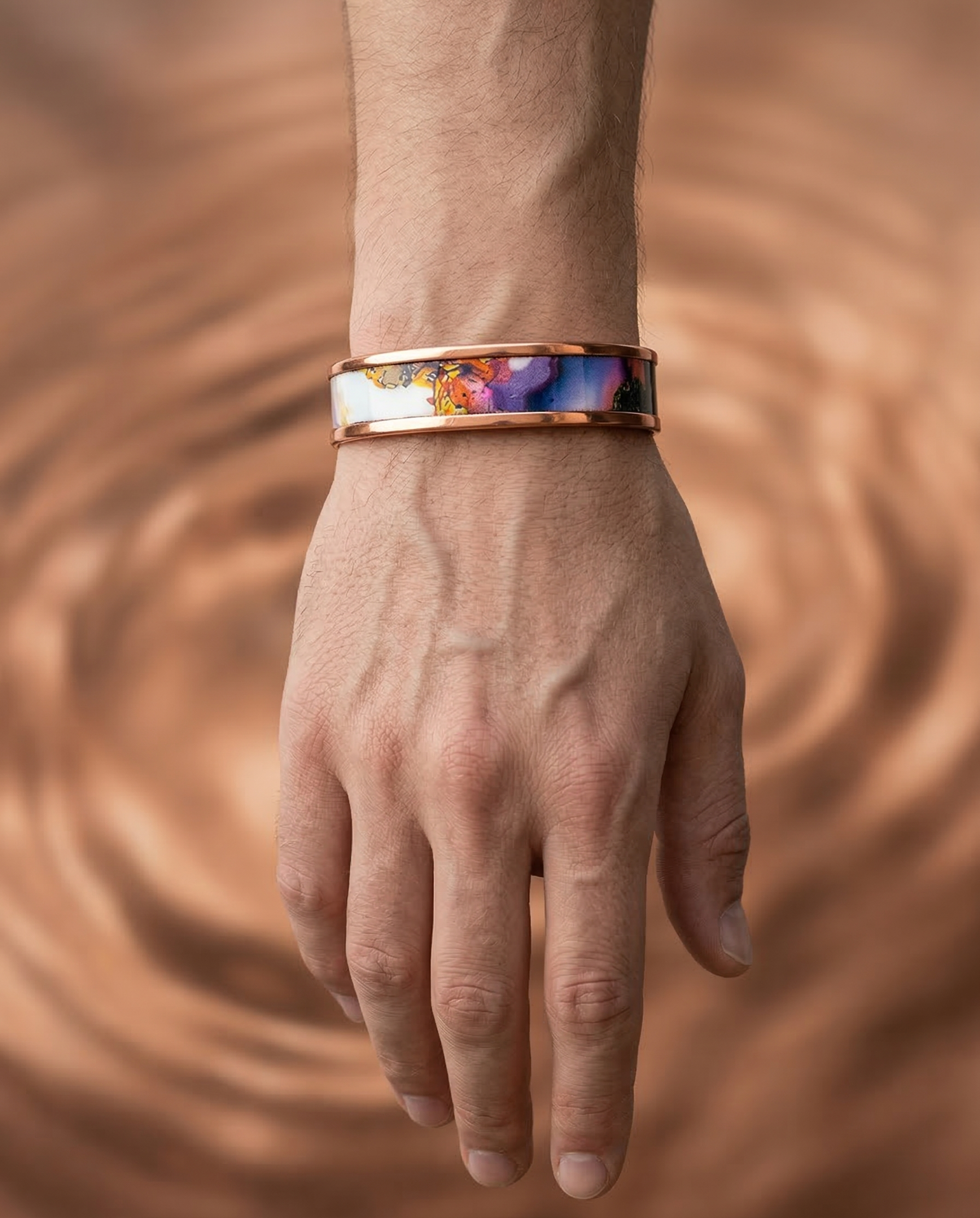 Bakırın sıcak dokusuyla birleşen bu tasarım, bileğinde taşınan küçük bir sanat eseri gibi hissettirir. Her açıdan farklı bir renk uyumu sunarak stiline özgün ve dikkat çekici bir karakter kazandırır.