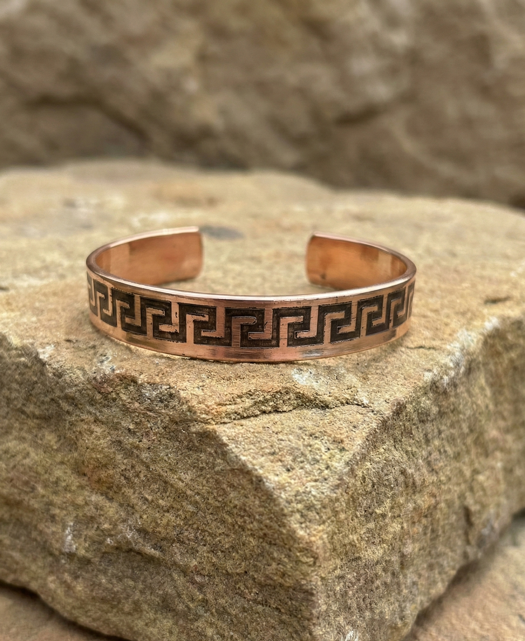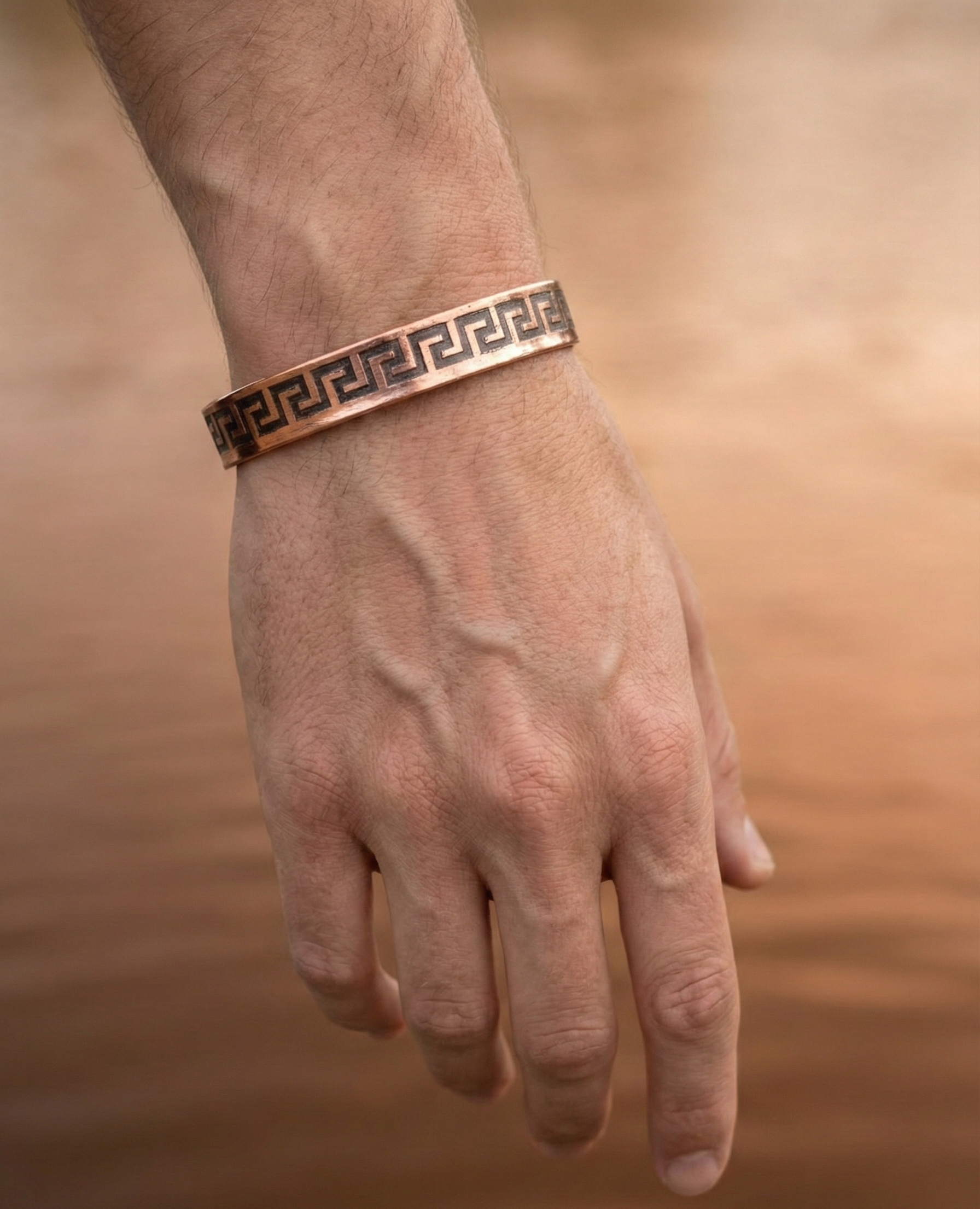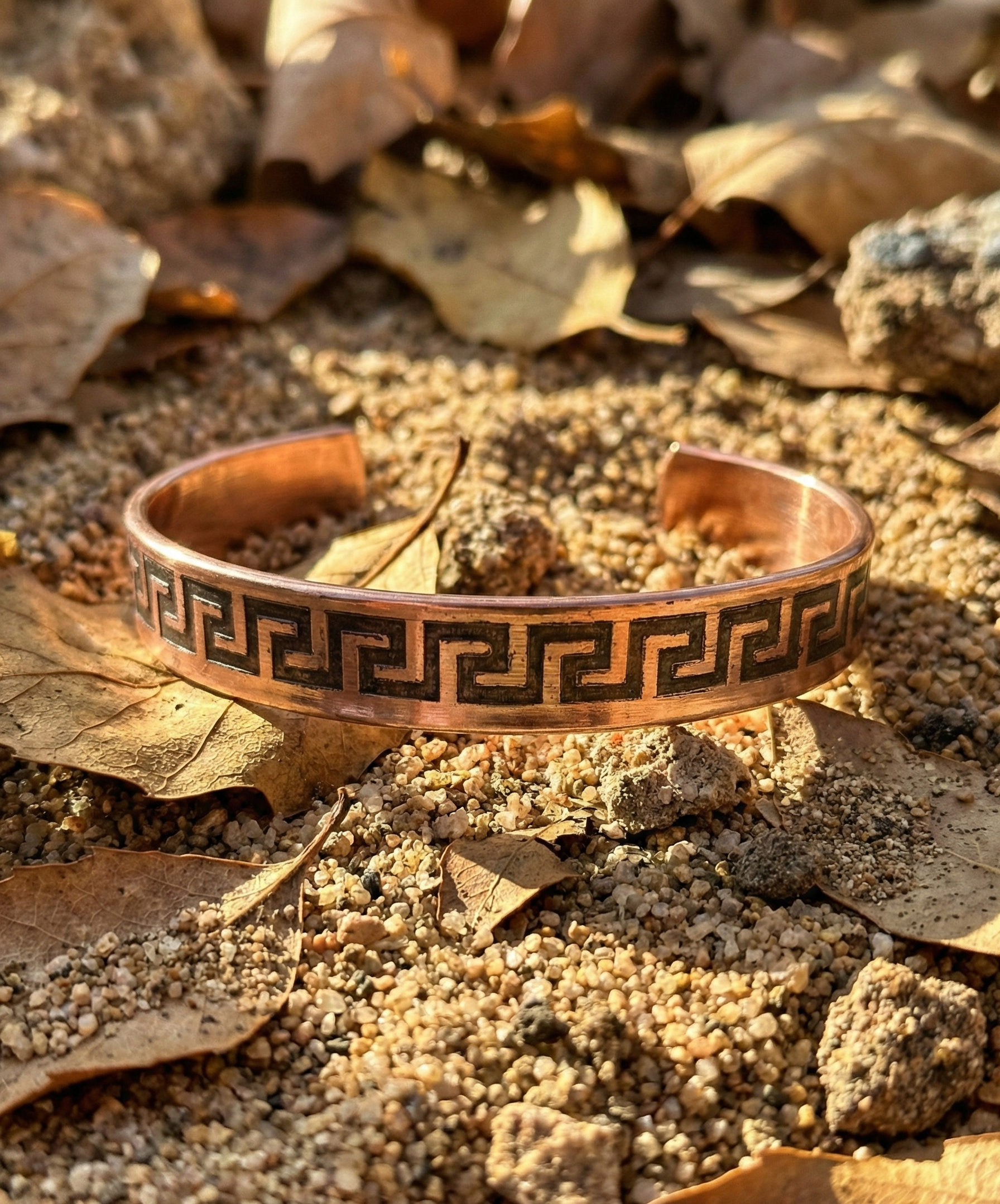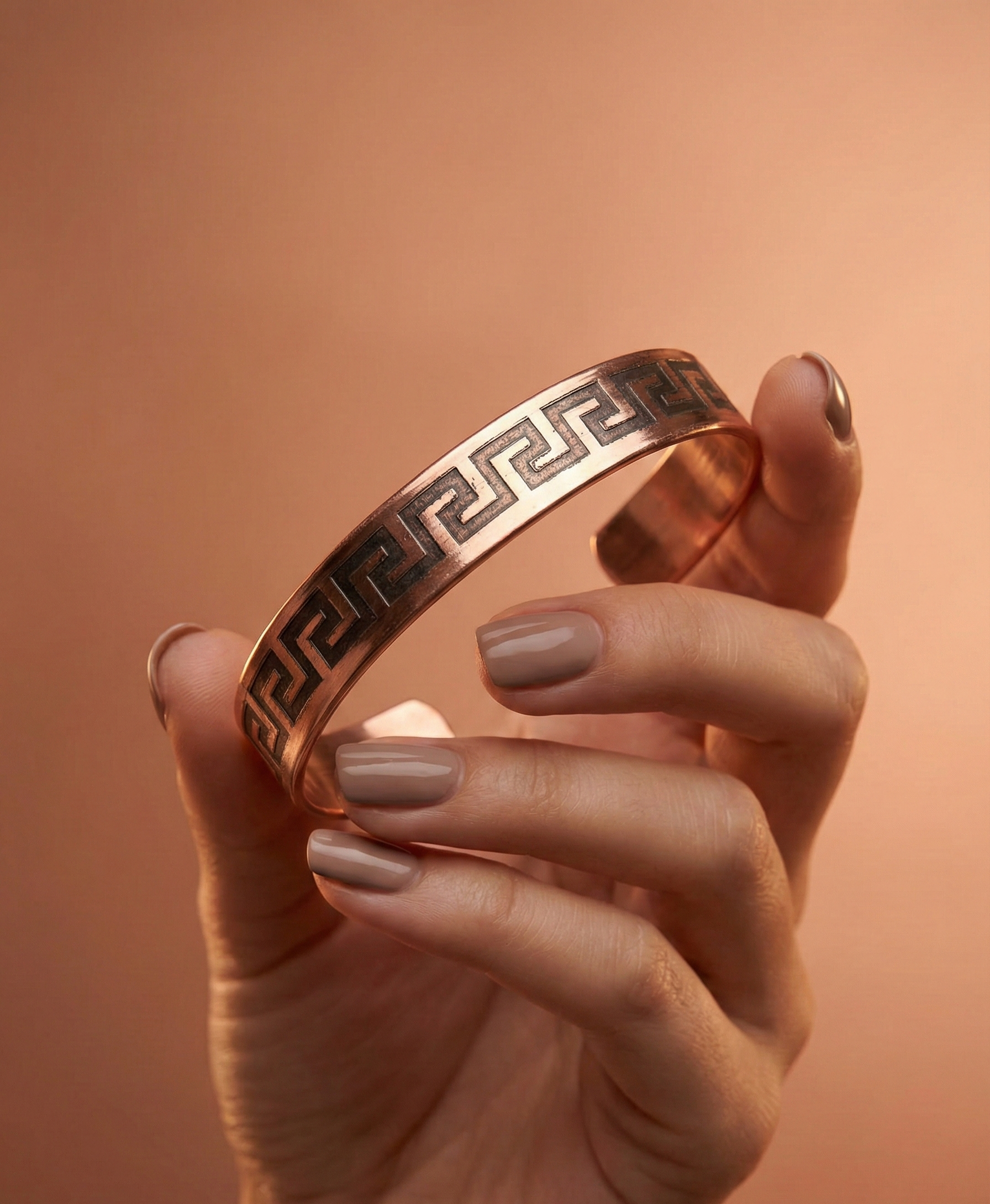 Doğal bakırın sıcak dokusuyla birleşen bu tasarım, sade ama güçlü duruşuyla günlük stilini tamamlar. Hafif yapısı sayesinde gün boyu konfor sunar, şık detaylarıyla her kombine karakter katar.