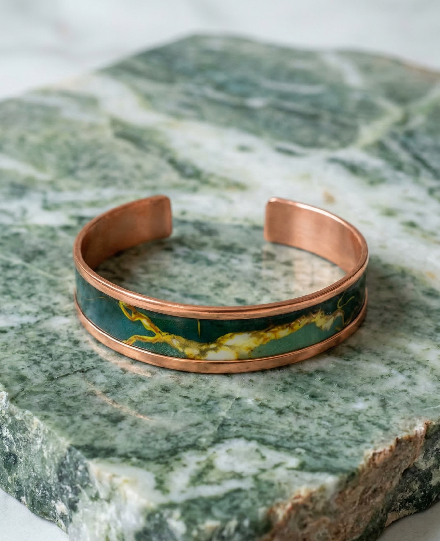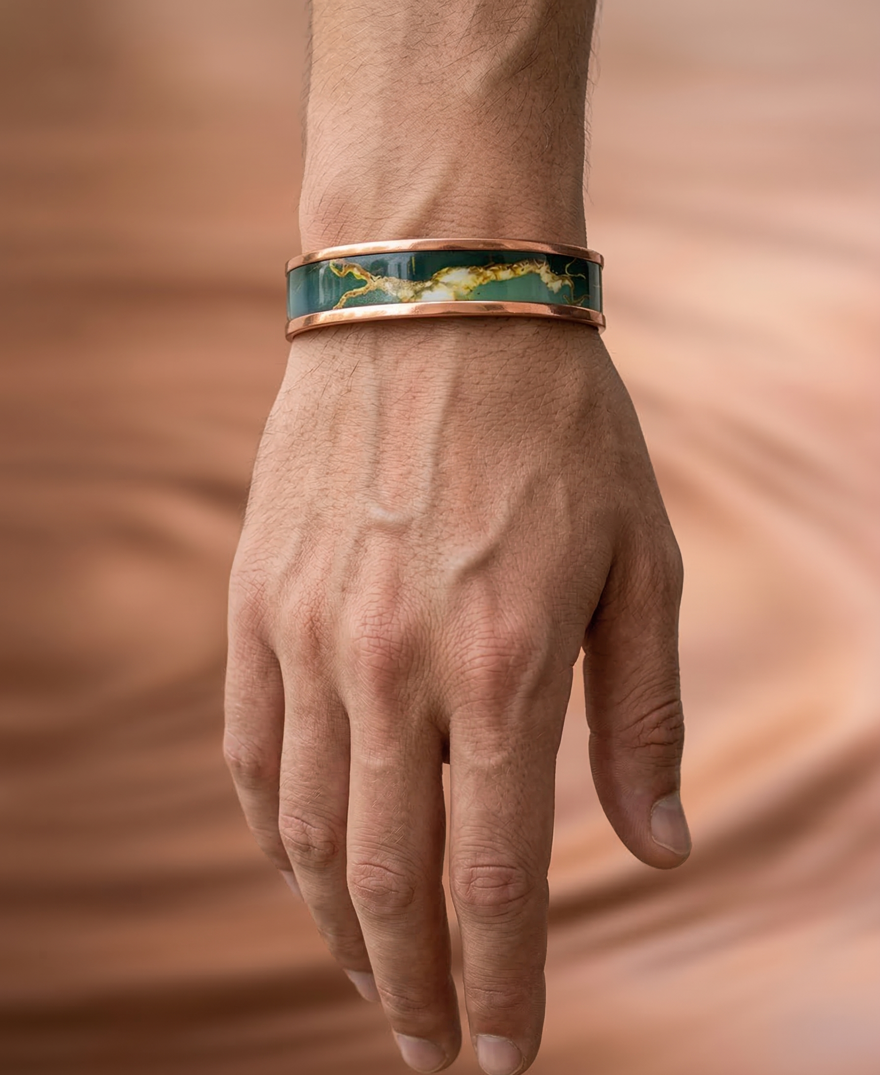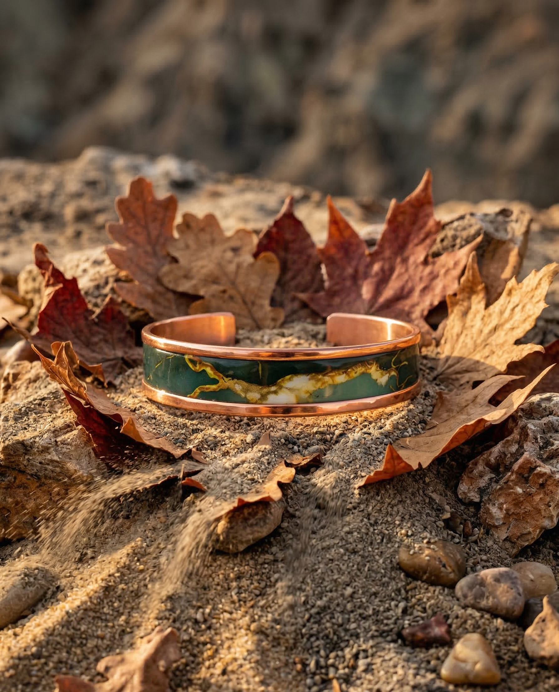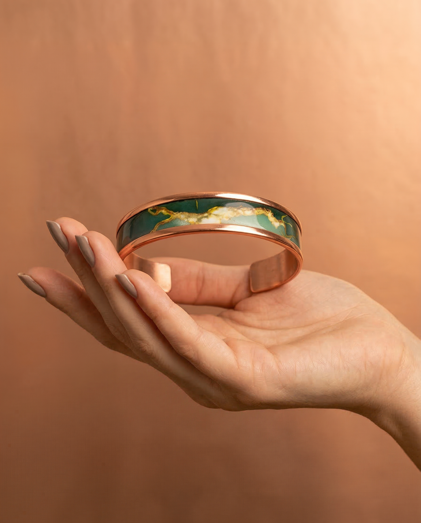 Zümrüt Akışı, zümrüt taşının mistik tonlarından ve doğadaki akışın zarafetinden ilham alır. Yeşilin derin tonları ile altın dokuların birleşimi, bakırın sıcaklığıyla buluşarak doğal ama etkileyici bir görünüm oluşturur.
