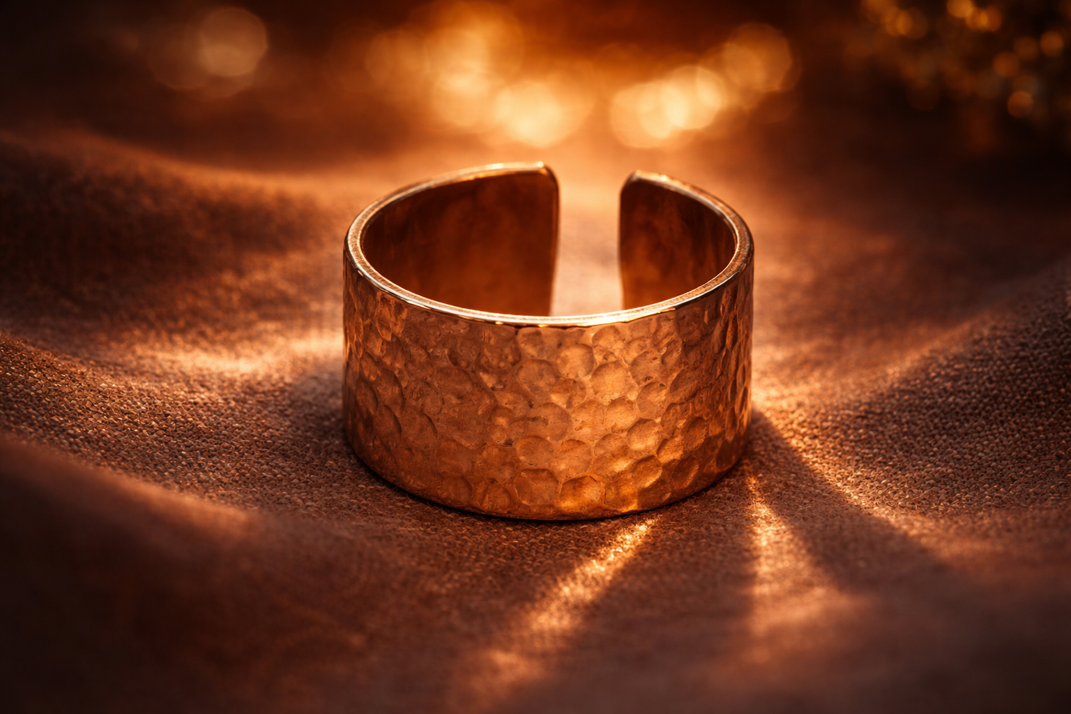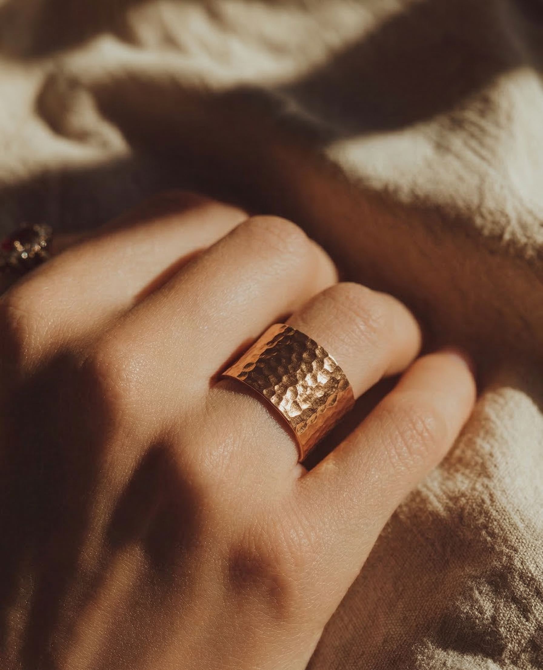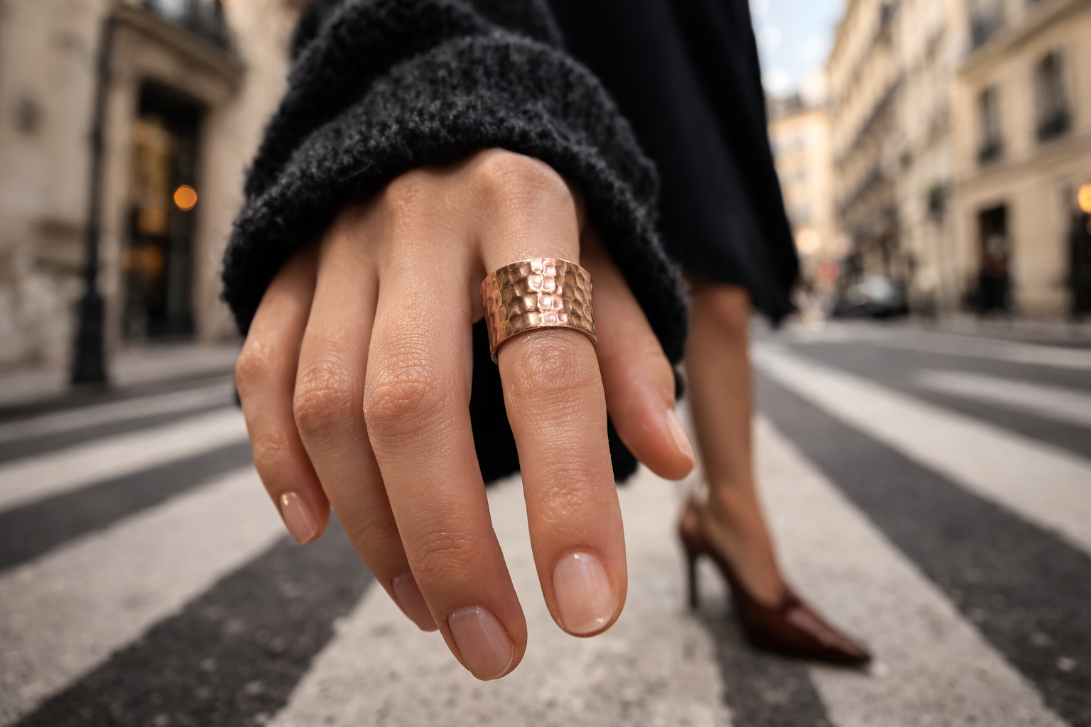 Doğal bakırın sıcaklığı ve tok formu, hem konfor hem de güçlü bir duruş sunar. Günlük kombinlerde sade şıklık sağlar, özel anlarda ise sakin ama etkili bir tamamlayıcı olur.